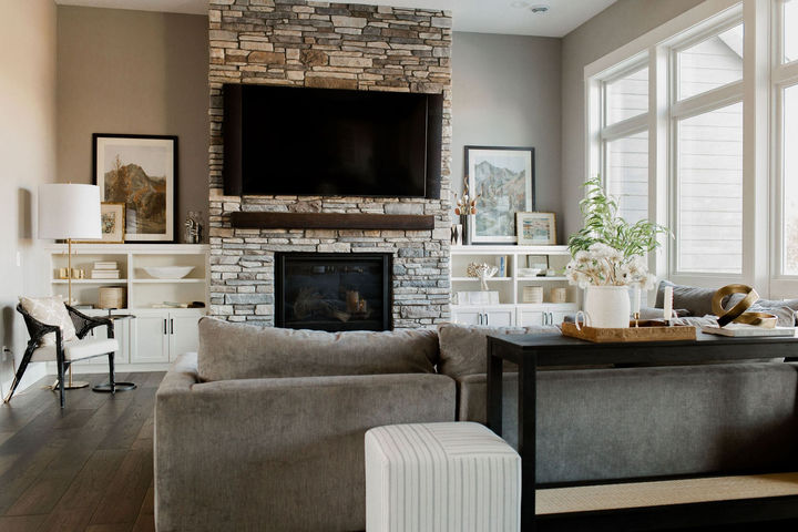 A new build, one level farmhouse with rich textural details in the walnut wood, stone masonry, and mixed metals. New furnishings throughout while addressing lighting, rugs, and textiles.