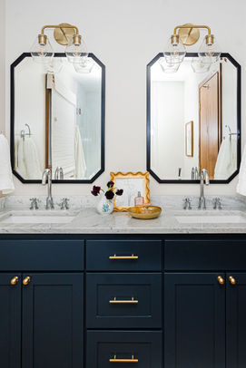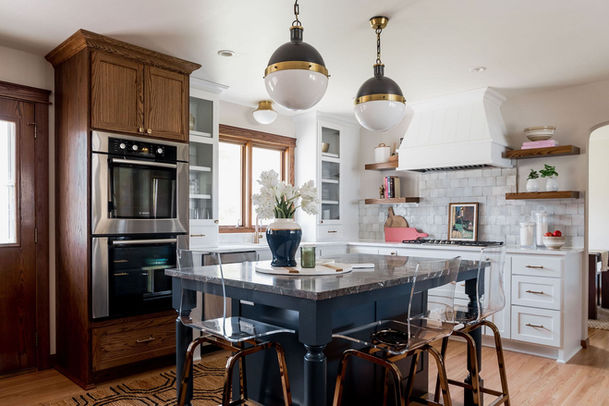 Transitional style with pops of color. Detailed and artisan tile work, quartz countertops, statement lighting and a reimagined layout.